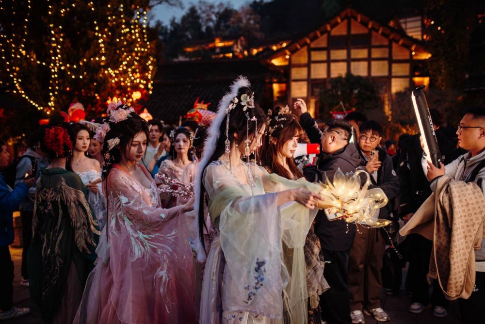 清晨,游客可参与颂钵音疗,在高级音疗师的引导下,通过声波振动与呼吸功法释放压力,让身心在自然中苏醒。随后沿着梯田步道漫步而上,置身油菜花海,感受春日的第一缕温柔。白天,十二花神游船巡游、手作工坊、民俗展演轮番登场;夜晚,无人机腾空而起,板凳龙与鱼灯队伍点亮夜空,篝火燃起,来自天南地北的人们在音乐与火光中尽情舞动。这种“晨起疗愈、日间游赏、夜晚狂欢”的全时沉浸体验,让度假不再是走马观花,而是一场与自我、与他人、与自然的深度对话。