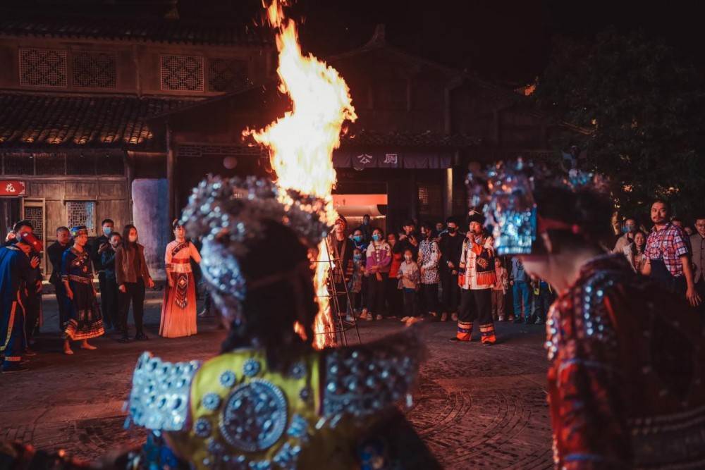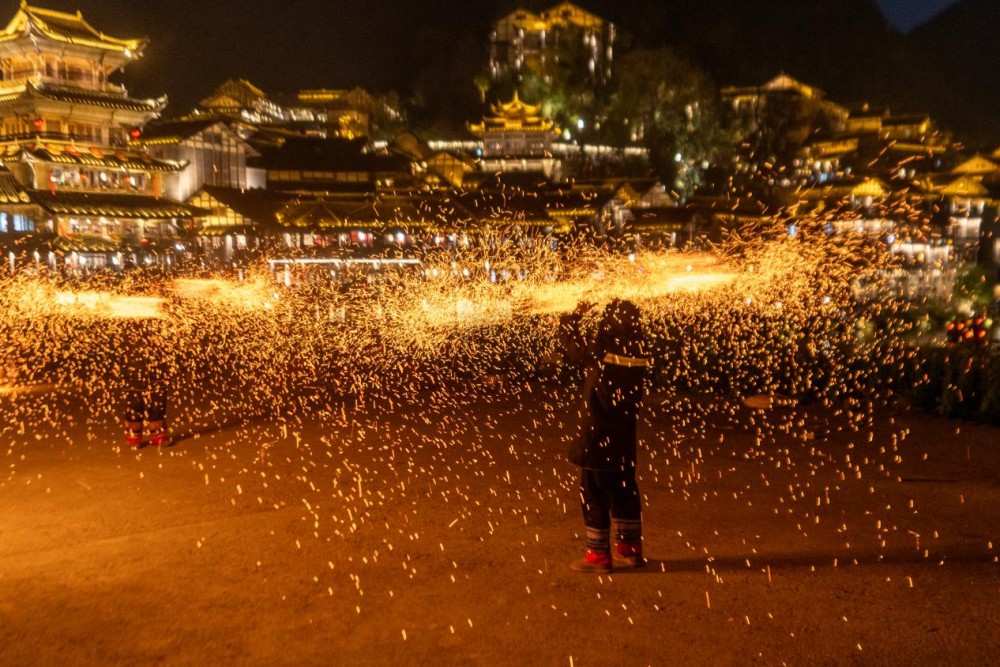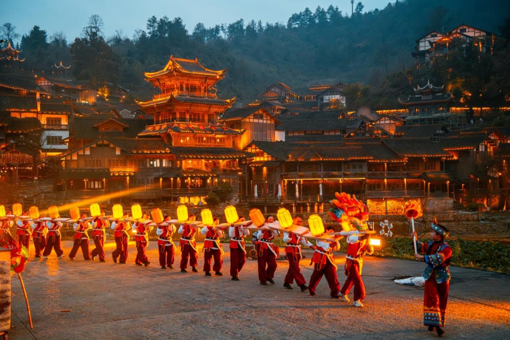 当夜幕降临,乌江寨展现出另一番景象。无人机编队腾空而起,在夜空中变幻出春日意象与花神图案;火舞表演与篝火晚会点燃山谷的激情;板凳龙与鱼灯队伍穿梭于古街巷陌,再现传统民俗的热闹场景。科技与传统的碰撞,让乡村的夜晚不再沉寂,而是充满活力与想象。