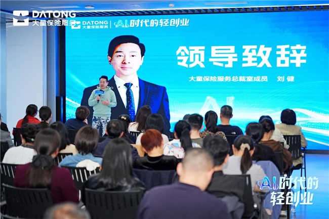 大童保险服务总裁室刘健先生登台致辞。他首先对现场嘉宾的到来表示欢迎,指出ai时代的到来,为保险行业带来了颠覆性变革,也为轻创业开辟了全新赛道。大童保险服务始终坚持人才为本,深耕行业十余载,不断迭代创业赋能体系,依托前沿ai技术,优化创业流程、降低创业成本、提升服务效率,致力于为每一位创业先锋提供无后顾之忧的发展平台,欢迎“先锋派 选大童”,携手借助ai科技的力量,打破传统创业壁垒,开启轻创业的全新征程,实现个人价值与行业发展的双向共赢。